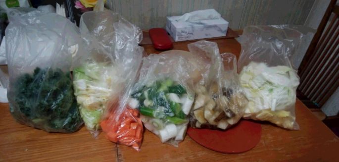 スーパーで、気に入ったものを買います。体に必要なものに目が行くと思います。それを細かく刻んで、袋詰めにします。